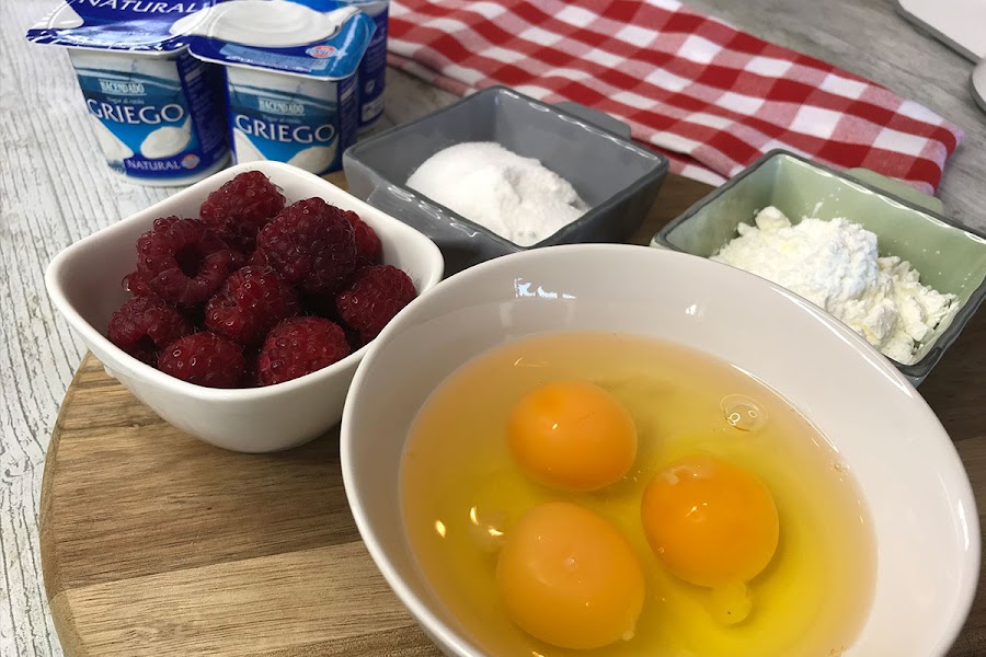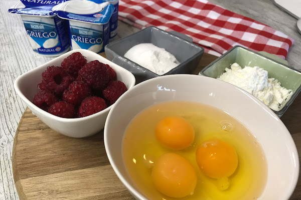 Batimos con una batidora o robot de cocina todos los ingredientes excepto las frambuesas. No hace falta batir mucho, no queremos que se queden burbujas de aire.Paso 2