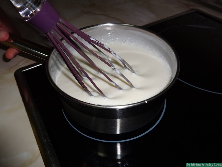 En un cazo, vertemos los yogures, la leche y el azúcar. Ponemos a calentar a fuego medio mientras no dejamos de remover.