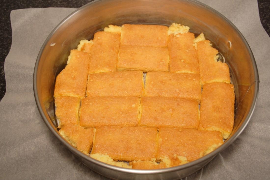 La podemos hacer con galletas y mantequilla, con bizcochos de soletilla, con una base de bizcocho, pero me he decidido por unos sobaos.