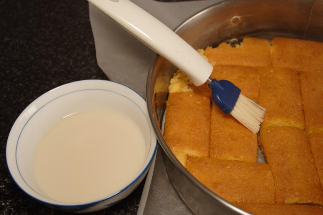 Mezclamos el ron con la leche y vamos empapando los bizcochos con ayuda de una brocha, que queden bien húmedos para que la base quede jugosa. Reservamos.