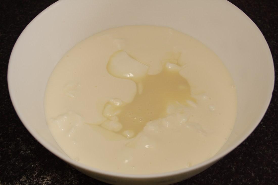 En un bol ponemos los yogures, la nata (crema de leche) sin montar y la leche condensada. Mezclamos con las varillas manuales unos 5 minutos, que quede todo bien emulsionado. Añadimos la gelatina fundida y seguimos batiendo hasta que se incorpore a la mezcla.