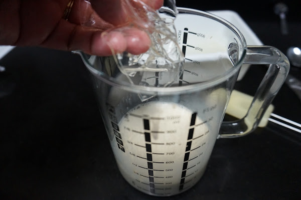Cuando se hayan disuelto bien echaremos esta mezcla a los yogures y lo batimos bien.