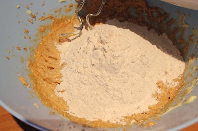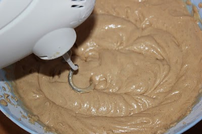 Añadiremos por tercios sin dejar de batir el preparado que hicimos de harina con el polvo de hornear. el bicarbonato y la canela y entre los tercios vamos añadiendo zumo de manzana para ayudarnos a batir bien para ir haciendo masa.