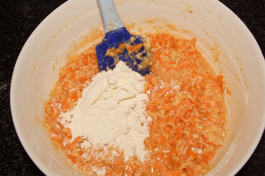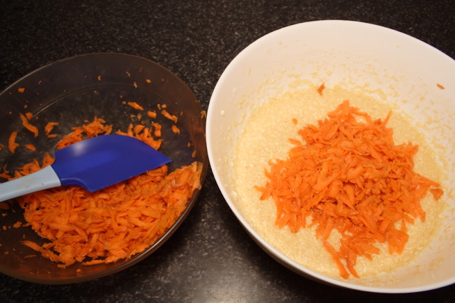 Añadimos la zanahoria rallada y vamos incorporando con una espátula, poco a poco. Echamos la harina con la levadura despacio y la vamos integrando a la mezcla con movimientos envolventes y suaves.