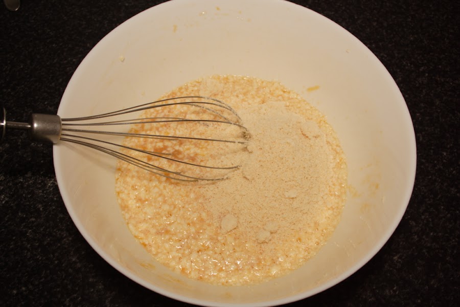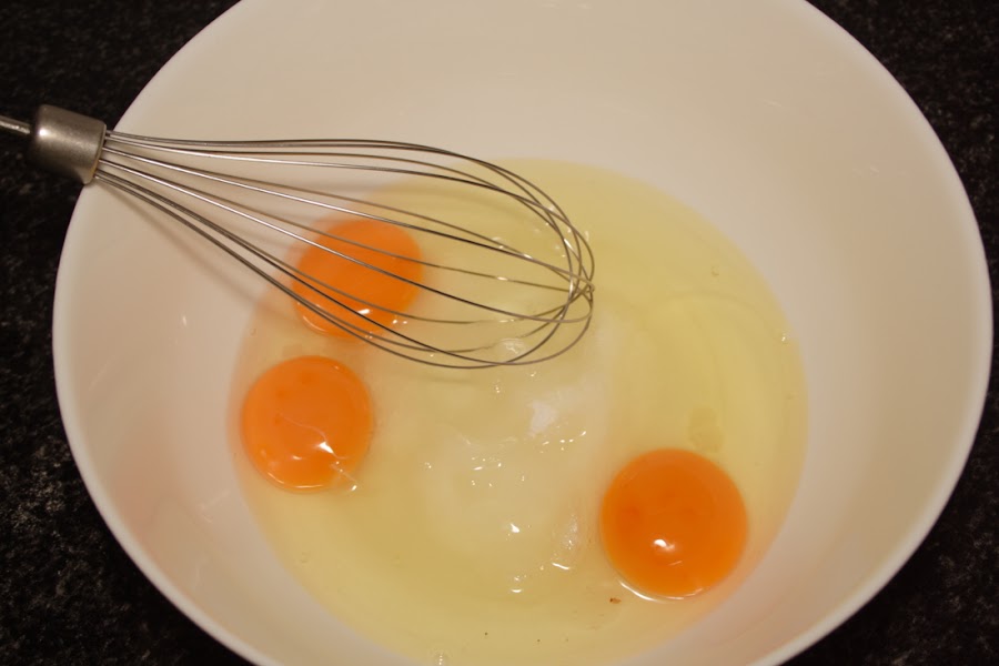En un bol ponemos los huevos y el azúcar, batimos con las varillas y la batidora. Cuando este todo bien batido añadimos la mantequilla a punto pomada (la calentamos en el microondas pero sin que se derrita). Seguimos batiendo con las varillas. Incorporamos el coco y seguimos batiendo.