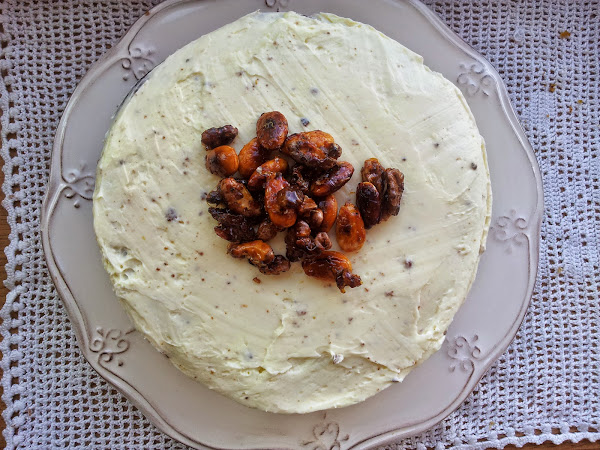 To decorate I toasted some almonds and walnuts in large pieces and have them added sugar until they have caramelized. Remove from heat to not catch too much color and when cool remove something because if not stay in one block. Decorate your cake with nuts cool completely.