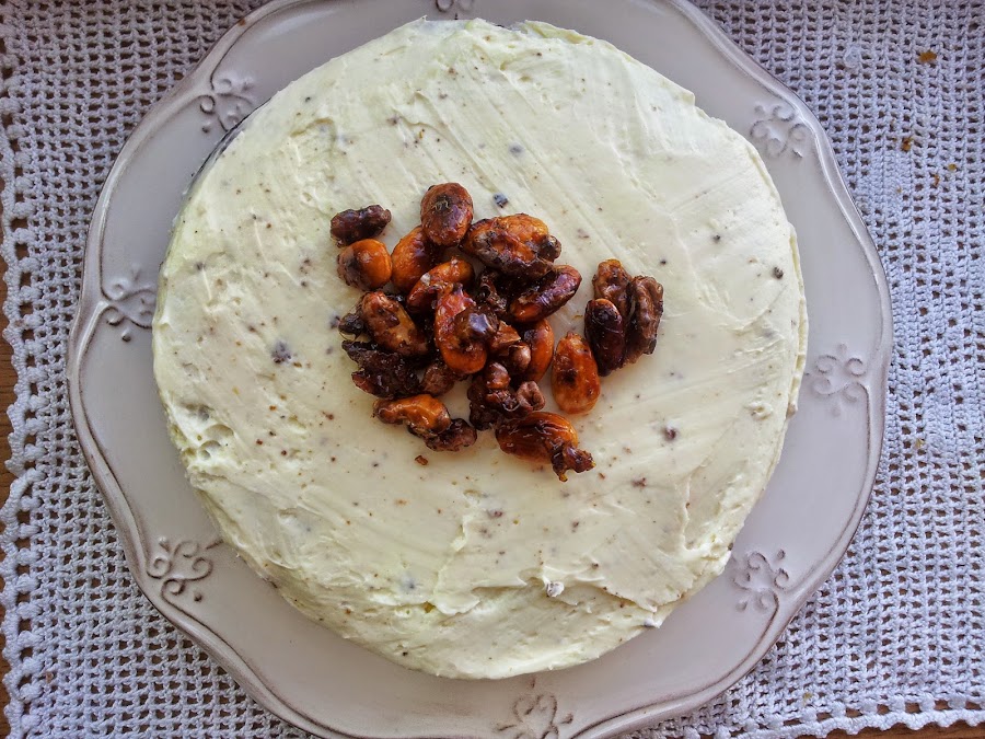 Para decorar he tostado unas almendras y nueces en trozos grandes y les he añadido azúcar hasta que se han caramelizado. Retirar del fuego para que no cojan demasiado color y cuando enfríen algo separar porque si no se quedarán en un bloque. Adornar vuestra tarta con los frutos secos totalmente fríos.
