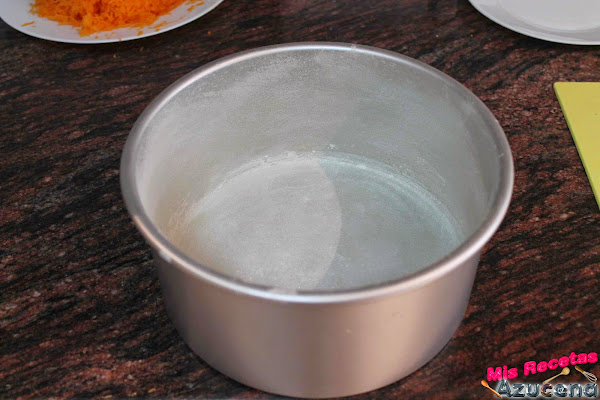 Cogemos un molde de 20 centímetros de diámetro, con ayuda de nuestras manos le untaremos un poco de mantequilla por base y las paredes, después le ponemos un poco de harina le damos vueltas para que se pegue la harina por todos sitio, le damos la vuelta y le damos unos golpecitos para quitarle el exceso de harina.
