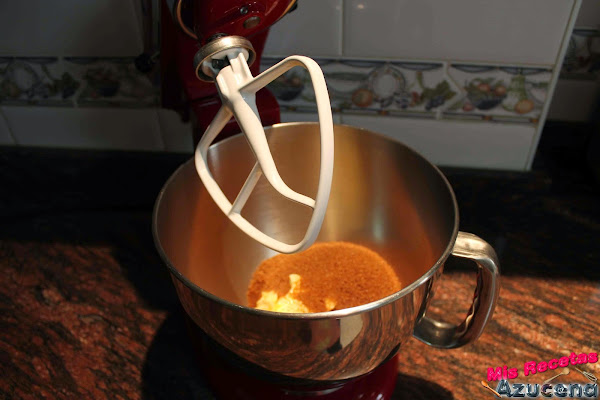 En un bol o en la amasadora pondremos la mantequilla junto con el azúcar moreno y con ayuda de unas varillas eléctricas o la amasadora batiremos a velocidad media hasta formar una crema.