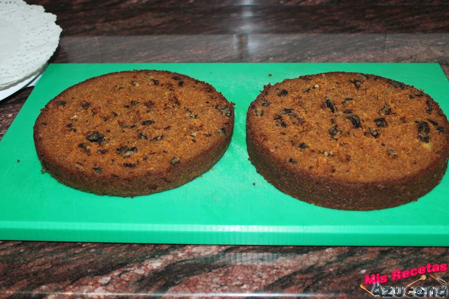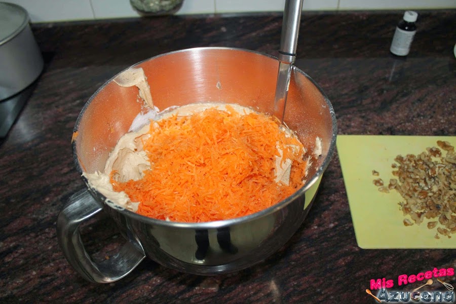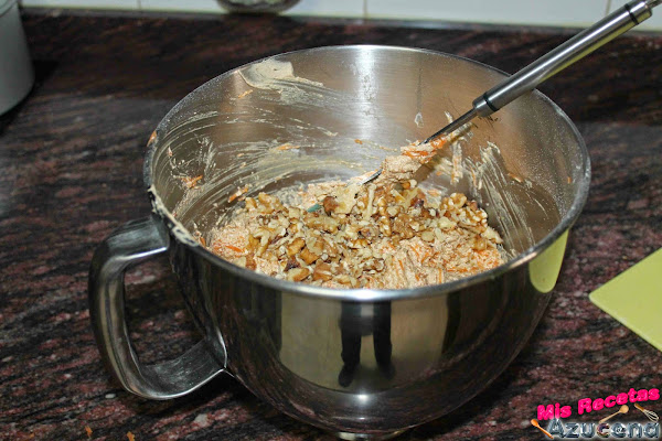 Pasados los 2 minutos pararemos de batir, añadiremos la zanahoria y las nueces mondadas que las habremos picado un poco, con ayuda de una legua y con cuidado mezclaremos bien para no desmenuzar mucho las nueces y la zanahoria.