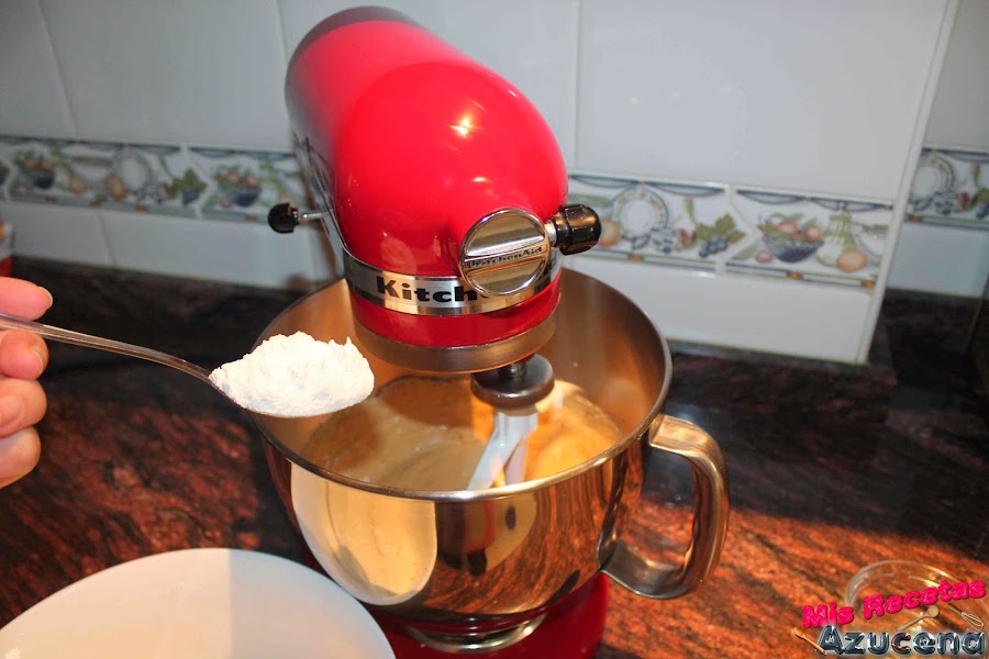 Ahora iremos añadiendo el contenido del bol donde tenemos la harina tamizada, este lo iremos añadiendo poco a poco hasta terminar con toda la harina, una vez tengamos toda la harina añadida seguiremos batiendo unos 2 minutos más para que se mezcle todo bien.
