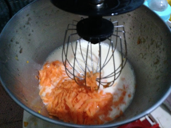 Empezaremos mezclando el azúcar con el aceite y cuando esté emulsionado, añadimos los huevos uno a uno. Añadimos el zumo de naranja con su ralladura y las zanahorias ralladas. Mezclamos en un bol la harina con la levadura química, la canela y el pellizco de sal, lo tamizamos y lo vamos añadiendo a la masa hasta que esté completamente integrado todo.