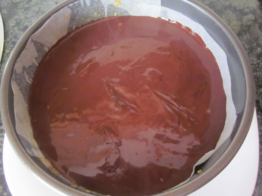 Se la ponemos en la tarta por encima y dejamos en la nevera hasta el día siguiente, además de estar mas rica, el chocolate ha cuajado mejor y facilita su decorado.