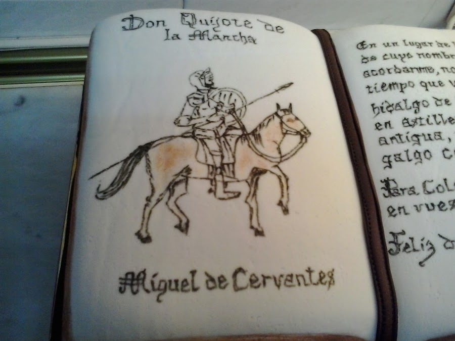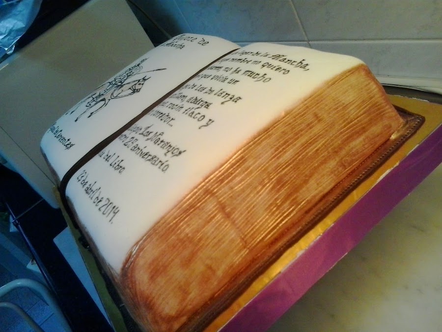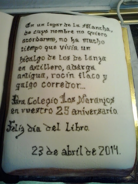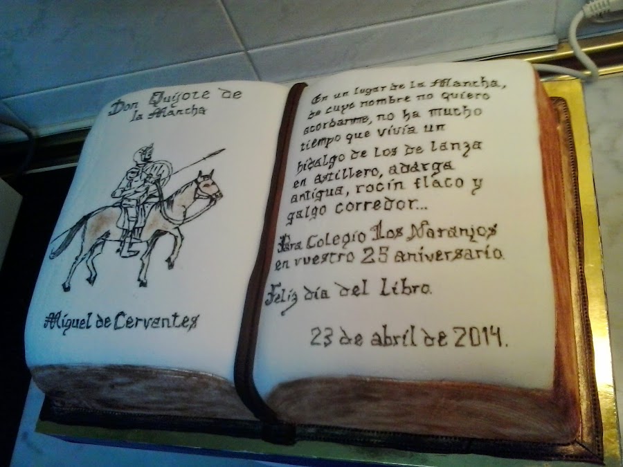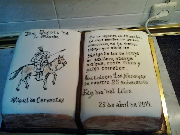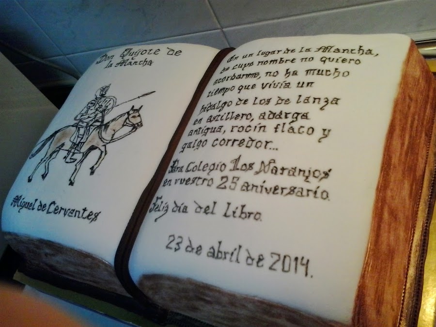 En cataluña justo en esta fecha se celebra la Diada de Sant Jordi que consiste en la leyenda de San Jorge y el Dragón, sin duda, la más difundida. En ella se nos presenta a San Jorge como un caballero que lucha contra un ser monstruoso que vivía en un lago y atemorizaba a la población. El dragón exigía el sacrificio de dos corderos para alimentarse cada día, a cambio de no atacar la ciudad. Cuando los ganaderos acabaron con la totalidad de sus animales como ofrendas, decidieron que el sacrificio sería humano; cada día elegirían al azar a una persona viva . Con tan mala fortuna que le tocó a la hija del rey. Cuando el dragón estaba a punto de devorarla, el caballero Sant Jordi la salvó matando al dragón con su lanza; de la sangre derramada brotó un rosal... y esa es la tradición: ellos regalan una rosa a ellas y ellas les regalan un libro a cambio. Para los libreros y editores, es el día del año que más libros se venden.Es una tradición muy bonita, en casa siempre nos ha gustado y nos hemos regalado un libro, o lo hemos intercambiado con algún amigo. En el colegio de mis hijos se sigue manteniendo esa magnífica tradición y uno de los actos importantes de este día consiste en realizar un intercambio de libros entre padres y profesores. El único requisito que se pide es que el libro esté en buen estado. Es una gran oportunidad para descubrir lecturas interesantes o algún libro especial. Y para clausurar todos estos actos y rendir homenaje al Día Internacional del Libro, el colegio el año pasado lo celebró con una tarta muy especial que narraba la leyenda que os he contado antes. Este año y para no ser menos, el broche final ha sido esta maravillosa tarta, basada en un grabado de Don Quijote de la Mancha y que comienza narrando la historia del famoso hidalgo. La tarta era de chocolate, rellena de buttercream de caramelo y bañada en almíbar de naranja. ¡Riquísima!