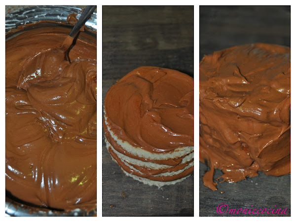Con la crema de chocolate vamos untando las capas de bizcocho y todo alrededor. Dejamos enfriar.
