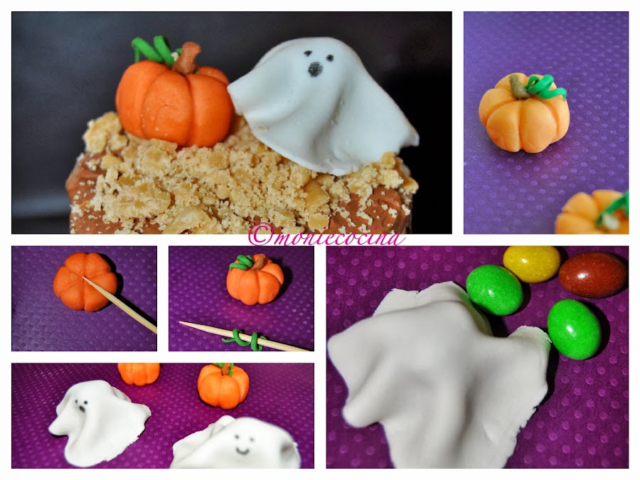Y los fantasmitas simplemente se estira el fondant, meto debajo un caramelo y dejo secar como si fuera una sábana. Cuando esté seco pinto los ojos con rotulador comestible y listo.