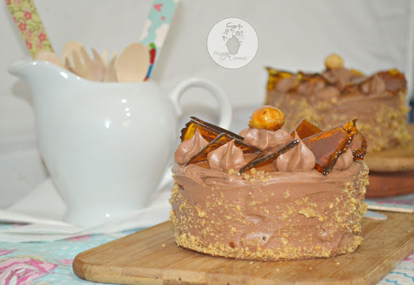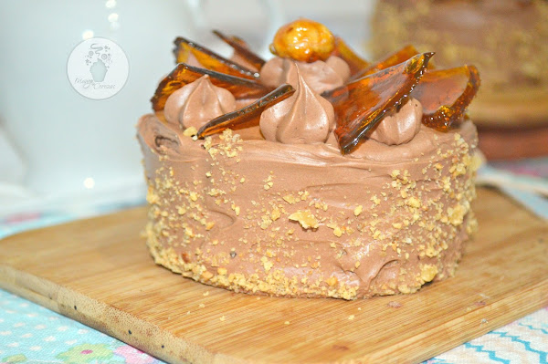 En pocas palabras lleva unos ingredientes infalibles avellanas+chocolate+vainilla+caramelo. Me encanta la estructura de esta tarta, esta compuesta por capas entre 5 y 8, entre cada capa nos encontramos una rica crema de chocolate, con una textura de otro planeta muy suave y untuosa, para darle ese toque crujiente, lleva un precioso decorado de chocolate y por los lados espolvoreamos con polvo de avellanas caramelizadas.