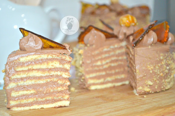 Esta tarta Dobos es muy popular en la capital Húngara, creada por el pastelero, József C. Dobos, Es un pastel considerado simple y elegante, su receta se mantuvo en secreto hasta 1906, solo se encontraba en exclusivos hoteles, restaurantes y pastelerías del mundo. ya que se conserva muy bien su sabor se intensifica con los días, aunque si es mi caso no me duro nada .