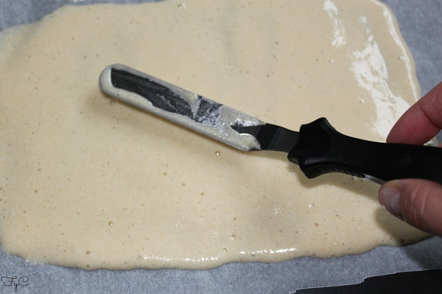 5. La pesamos y la dividimos en 6 partes iguales. Para cada uno de mis bizcochos empleé 90 gramos de masa, que puse sobre papel sulfurizado en una bandeja de horno extendiéndola con una espátula (foto). Horneamos 10 minutos cada capa. Dejamos enfriar en una rejilla.