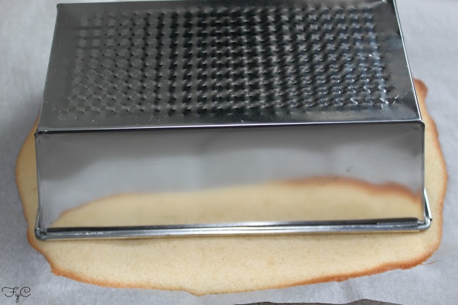 6. Si la hacéis rectangular como yo, tomamos el molde como medida y con un cuchillo recortamos cada cap (foto), así tendremos 6 capas de bizcocho rectangulares e iguales