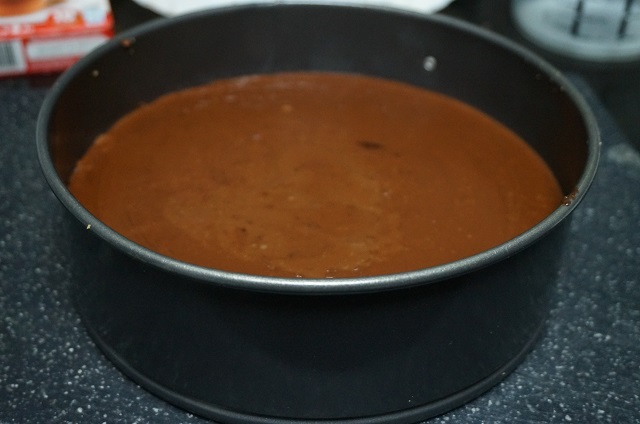 Sacamos la base de galletas de la nevera y poco a poco iremos echando la crema de chocolate, nos podemos ayudar con una espátula, así irá cayendo poco a poco.