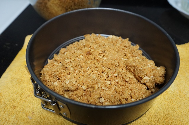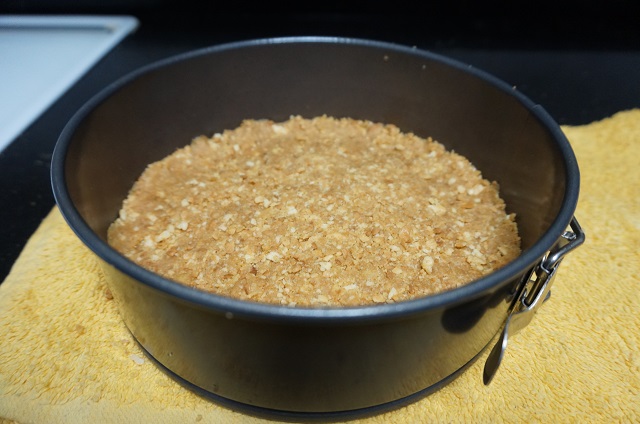 Ponemos la masa de galletas en el fondo de un molde desmontable, el grosor de la base será a vuestro gusto. Nos ayudaremos con una cuchara para aplanar la base de galletas y nos quede bien compacta. La meteremos en la nevera 30 minutos.