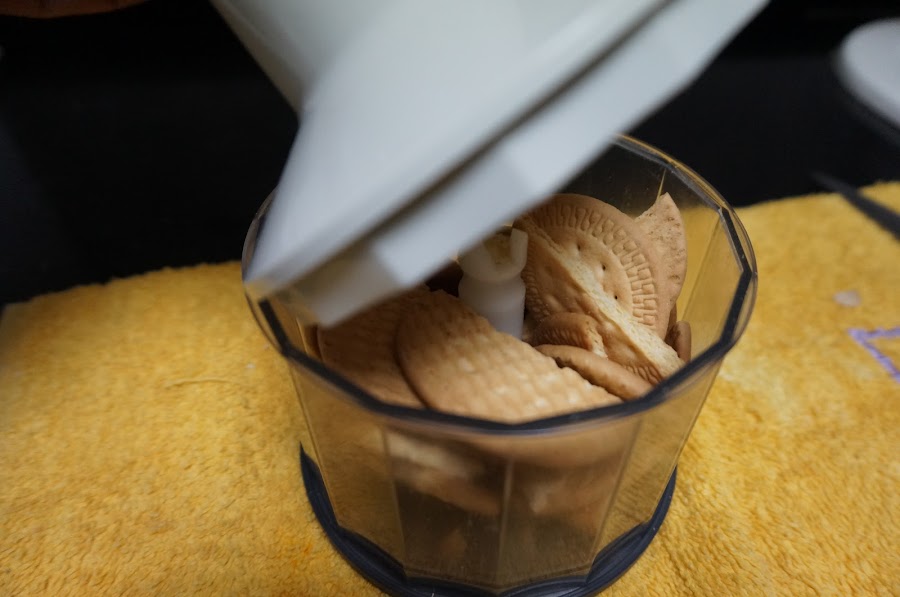 Lo primero trituraremos las galletas con una picadora hasta que quede molida.