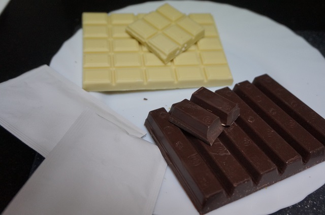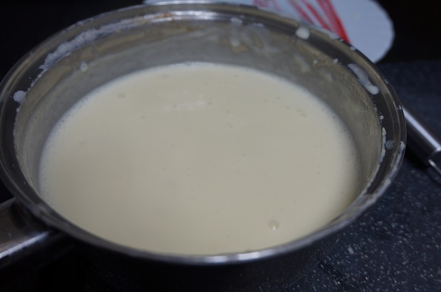 Repetimos lo mismo con el chocolate blanco. Ponemos los 300 ml. de nata (crema de leche) a calentar con el chocolate y el vaso de 200 ml. de leche con el sobre de cuajada disuelto, lo dejaremos a fuego suave hasta que empiece a espesar y lo sacamos.