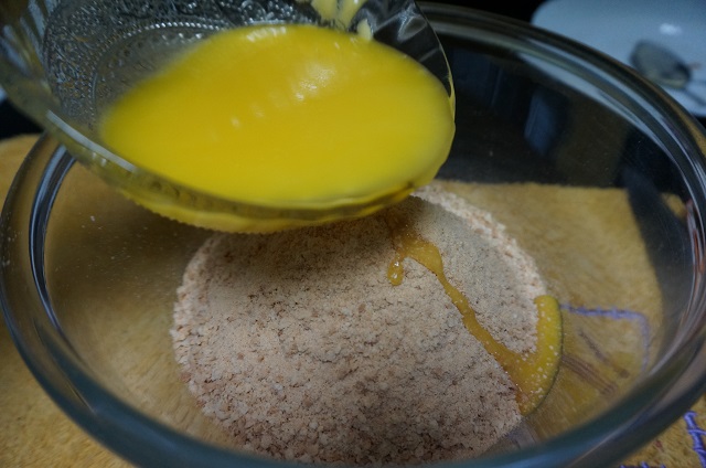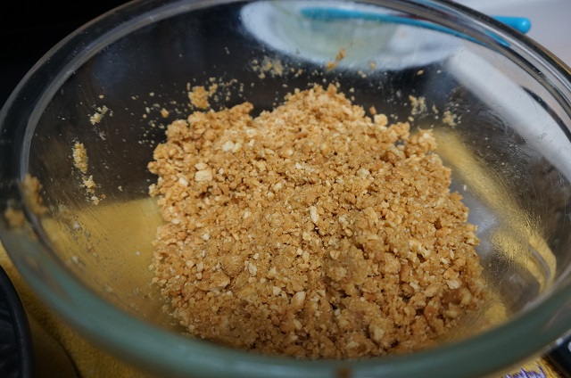Pondremos la galleta molida en un bol, derretimos la mantequilla unos segundos en el microondas y lo mezclamos con las galletas.