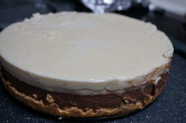 Lo echaremos sobre el chocolate que ya está cuajado con la ayuda de una espátula, poco a poco y lo meteremos a la nevera tapado con papel de plata, lo dejaremos 5-6 horas o mejor de un día para otro.