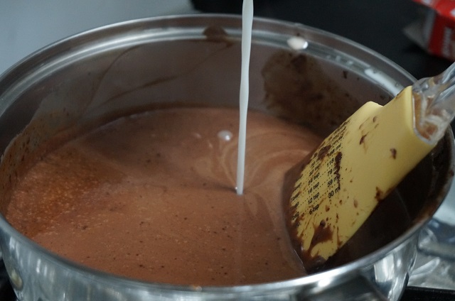 Ponemos un cazo con 300 ml. de nata (crema de leche) y el chocolate negro troceado. Lo tendremos a fuego medio removiendo hasta que esté disuelto, no tiene que hervir.