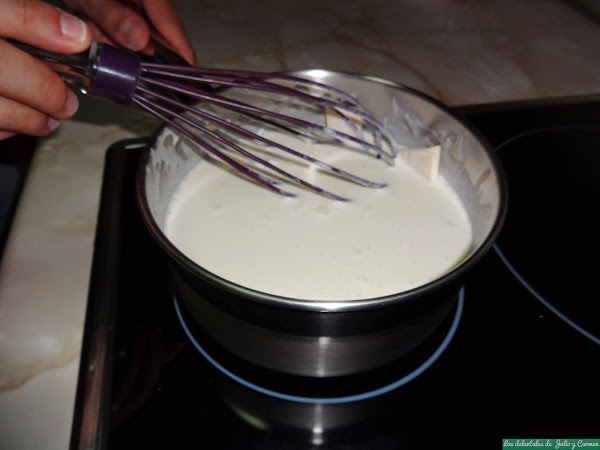 En un cazo, ponemos 300 ml de nata (crema de leche), el chocolate blanco partido en trozos y 200 ml de leche (la leche la habremos mezclado con un sobre de cuaja, removiendo bien y aplastando para que no nos quedara ningún grumo, y se deshagan en la leche). Lo ponemos a fuego medio-bajo sin dejar de remover.