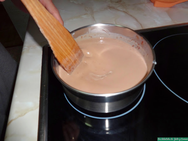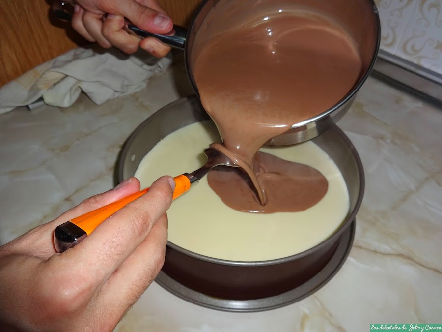 Una vez tengamos la primera capa cuajada, realizaremos la de chocolate con leche, exactamente de la misma forma que la blanca: Disolvemos la cuajada en la leche, y en un cazo unimos 300 ml de nata (crema de leche), el chocolate partido y la leche, removiendo hasta que falte poco para el hervor y lo vertemos, igual que antes, con mucho cuidado y lo dejaremos cuajar en la nevera. Según mi experiencia, mejor dejarla de un día para otro para que quede perfectamente cuajada.