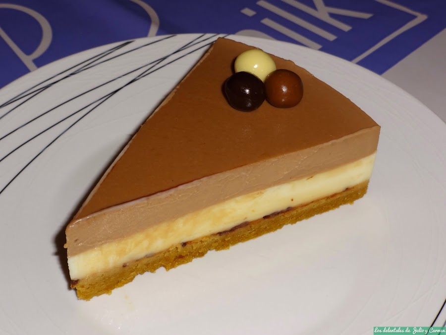 A muchos os sonara la conocidísima tarta tres chocolates, en la que se unen en una misma tarta y a base de capas, las tres variedades fundamentales: blanco, negro y con leche. A nosotros, tanto a Carmen como a mi, el chocolate en general nos gusta, pero sobre todo en dos de sus variedades, que son el blanco y con leche. El chocolate negro no es de nuestros favoritos, y aunque lo usamos bastante a menudo, si podemos elegir, nos quedamos con las dos primeras. Por este motivo nos decidimos por "quitar" una capa , aquella que menos nos gustaba, y dejamos una tarta que ya os podéis imaginar su sabor, y que nos gustó tanto que al poco tuvimos que repetirla para que la probara mas gente, que al igual que nosotros, quedaron encantados.