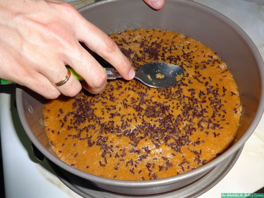 Echamos la mezcla en el molde, aplastando con la cuchara (sobre todo que quede bien tapado y cubierto por los bordes) y dejando la base uniforme por toda la superficie. Lo dejaremos en la nevera mientras preparamos los chocolates.