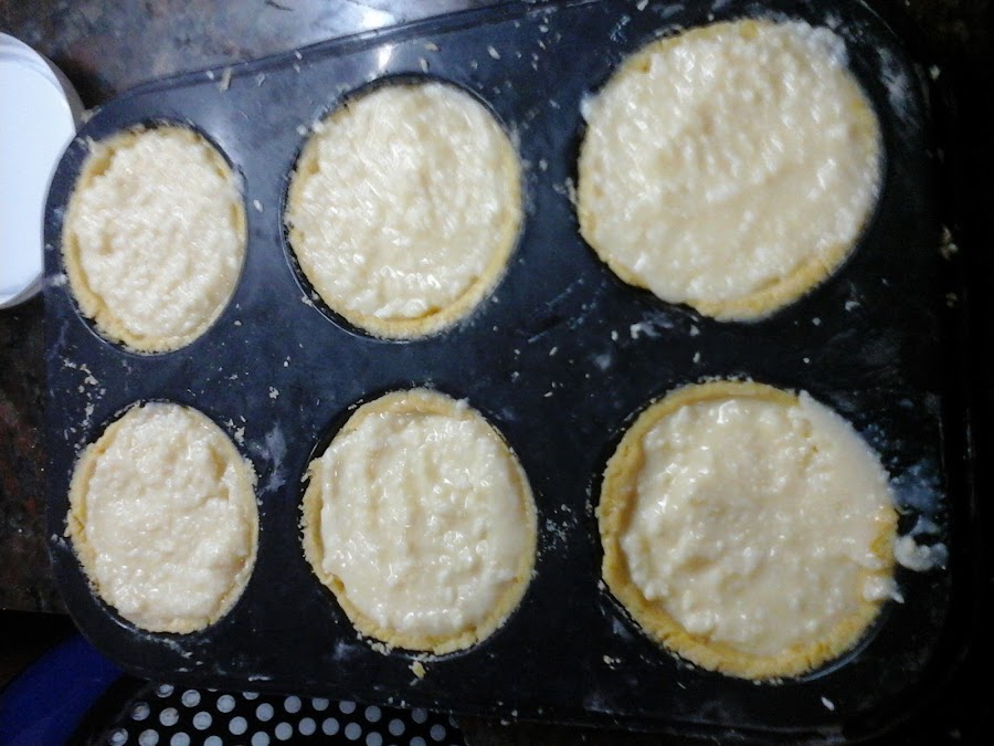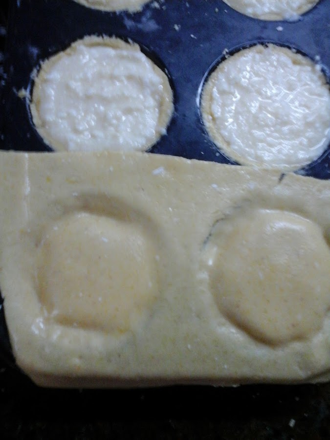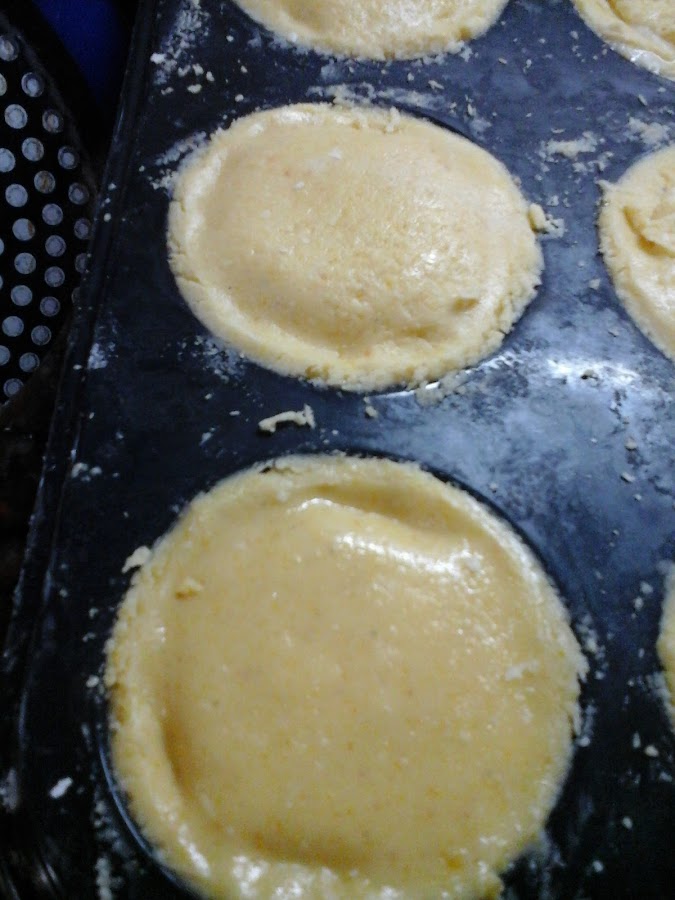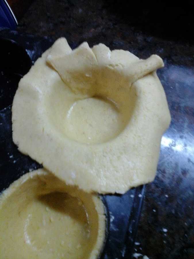 Luego estirar la masa según el molde que hayan elegido y cubrir el fondo y las paredes (dividir la masa en dos es buena idea para que la capa de arriba y la de abajo tengan la misma cantidad de masa). Yo hice tartitas individuales y estiré la masa bien fina, pero si se va a hacer una grande es preferible estirar la masa más gruesa para que no se parta al moverla al molde (aunque sí es bastante elástica para no tener gluten ni almidón de mandioca, no es una masa super elástica recuerden). Además es una masa que queda muy rica finita y también más gruesa, como es muy tierna y suave queda bien de ambas formas. También cabe notar que puede ser más cómodo estirarla sobre papel manteca y ayudarse con eso para moverla al molde o enrollarla en el palote de amasar y desdoblarla en el molde.