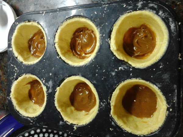 Cortar los bordes y poner dulce de leche en el fondo (si es común no pongan una capa muy gruesa porque se saldría en el horno, pero si es repostero sí pueden poner un poco más) y luego agregar el relleno hasta 3/4 o un poquito más del borde porque algo crece (yo agregué el relleno al ras y en el horno creció quebrando la masa de arriba, eso se ve en una foto más abajo).