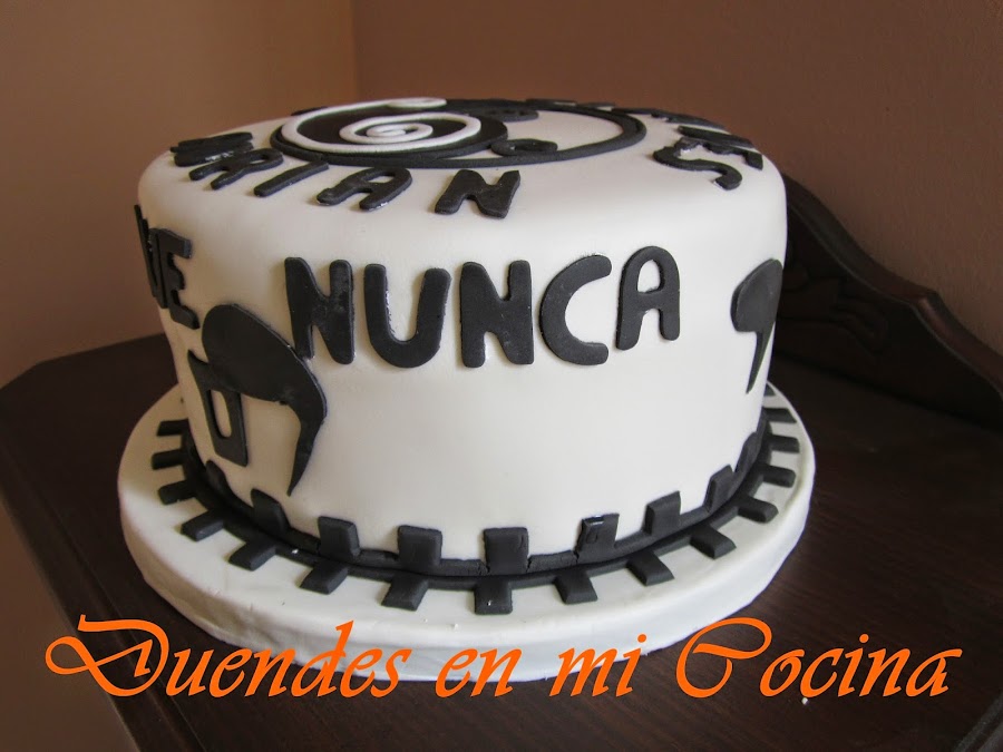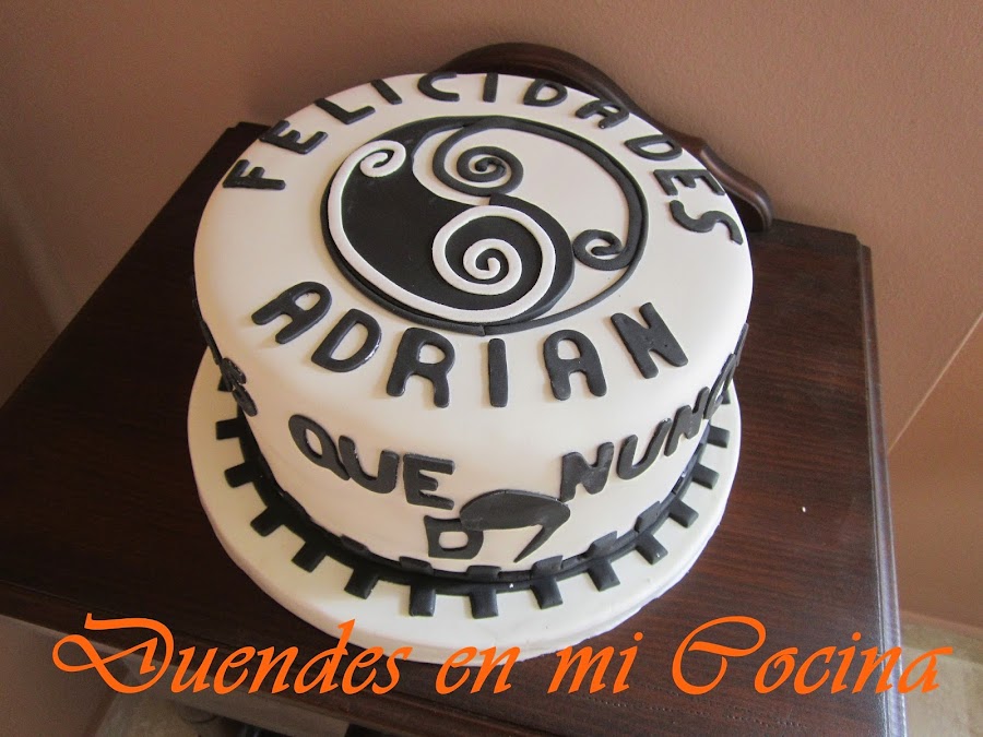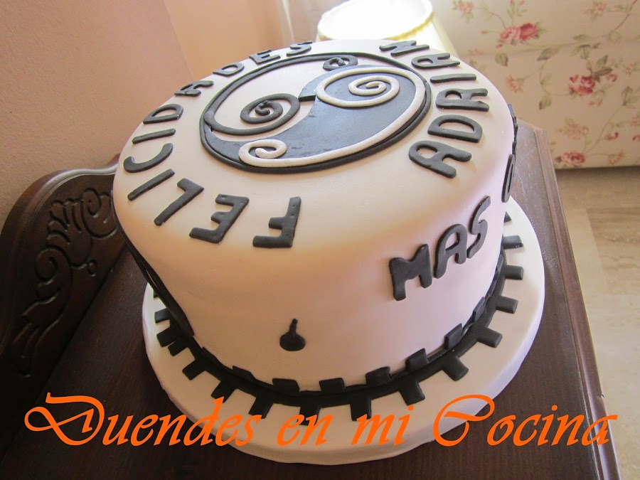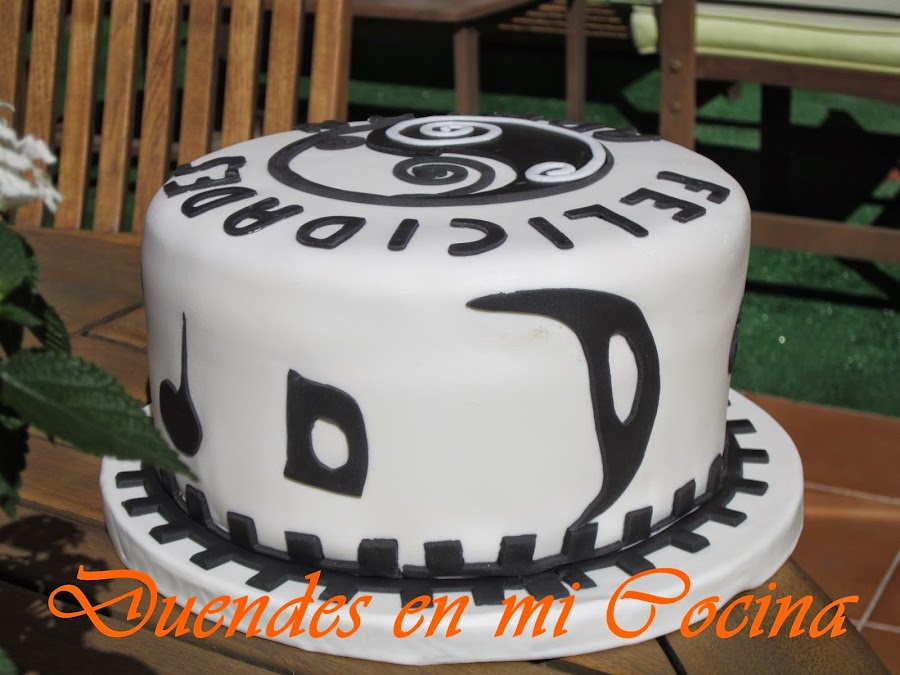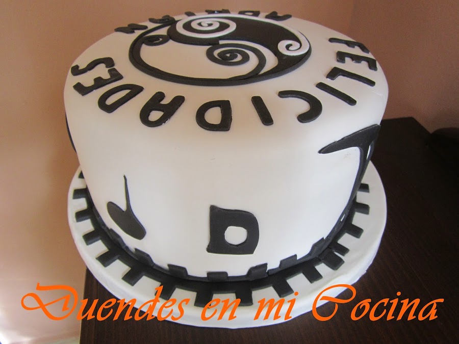 Este es un encargo de la semana pasada. Me llamó una chica que quería regalarle una tarta especial a su novio por su cumpleaños. Sólo quería que fuera sencilla y en blanco y negro y que la decoración me la dejaba a mí.