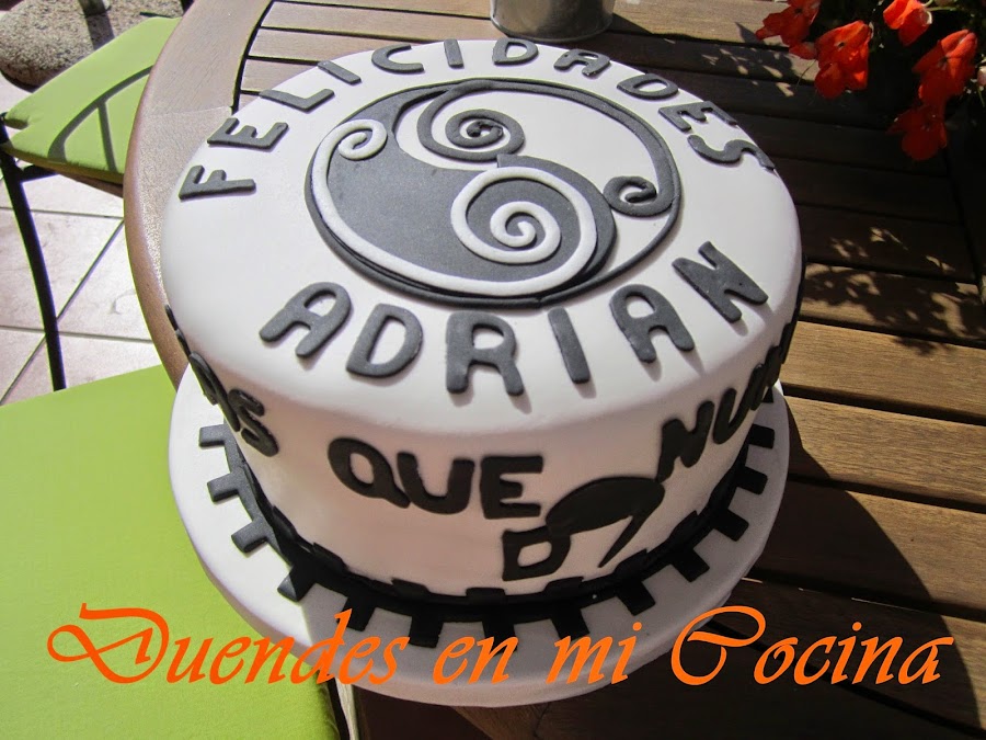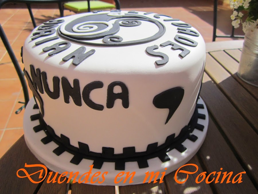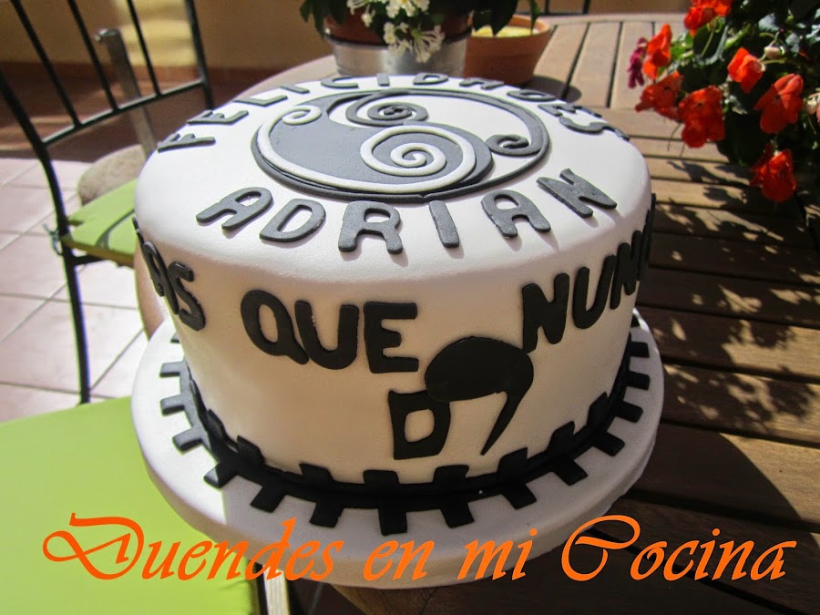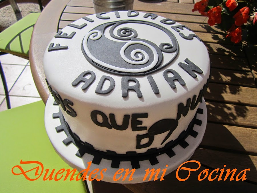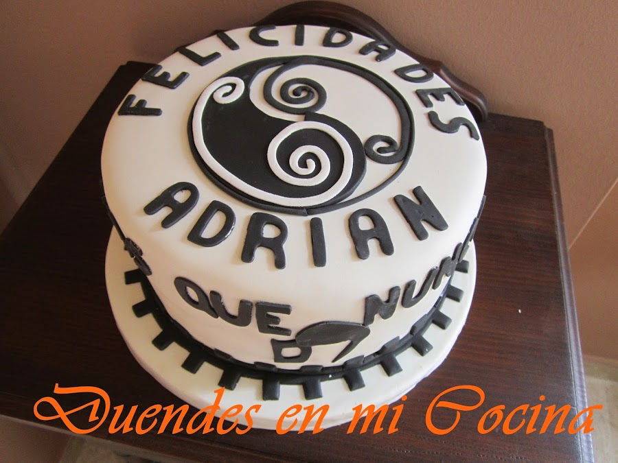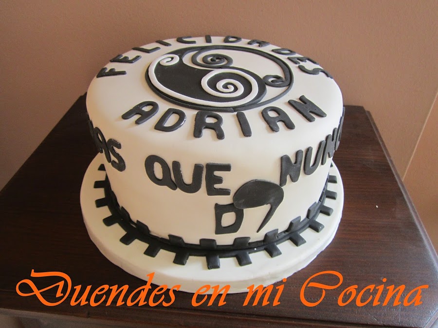Este es un encargo de la semana pasada. Me llamó una chica que quería regalarle una tarta especial a su novio por su cumpleaños. Sólo quería que fuera sencilla y en blanco y negro y que la decoración me la dejaba a mí.