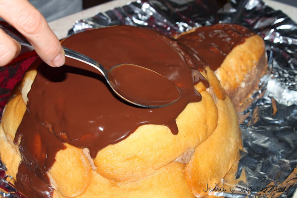 Hacemos la cobertura poniendo en un cazo el chocolate, y la nata (crema de leche) al fuego hasta que se derrita el chocolate. Lo retiramos del fuego y le añadimos la mantequilla, mezclamos bien y dejamos que se enfríe un poco, hasta que coja una consistencia en que se pueda cubrir bien sin que se caiga demasiado.