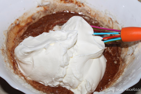 Cuando esté casi fría le vamos añadiendo las claras poco a poco y la nata montada (crema de leche) con movimientos envolventes.