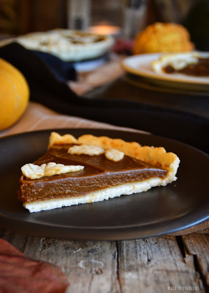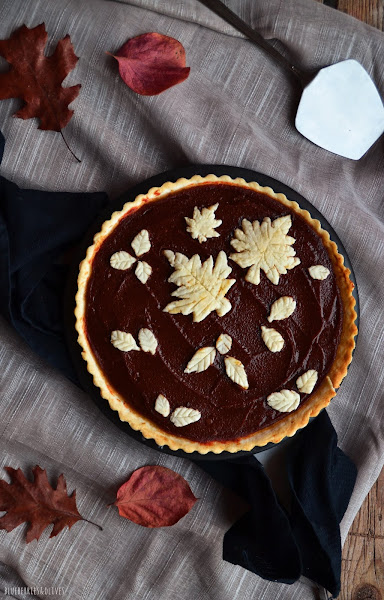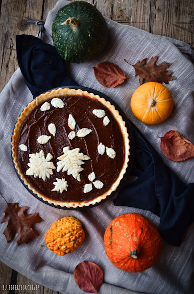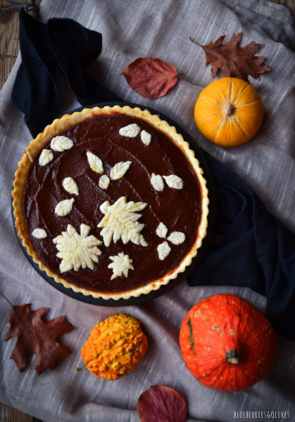 En cuanto a la masa de la tarta, hace tiempo que hago tests y pruebas y no consigo dar con una de mi gusto, así que he adaptado un poco la receta de masa quebrada sin gluten de Thermomix, usando mantequilla vegetal de coco. Se hace en un pispás y da muy buen resultado, la masa se maneja muy bien y no da problemas como he tenido en otras ocasiones. Con estas cantidades, da de sobra para la base y para decorar por encima como yo he hecho con formas de hojas, para darle un toque aún más otoñal. Sé que existen cortadores con diversas formas de hojas para hacer galletas etc, aunque estas las he hecho con mis manitas, mucha maña, paciencia e imaginación y un cuchillo de sierra.