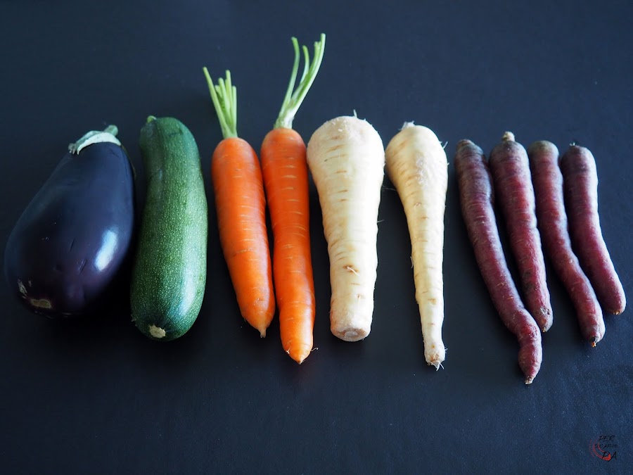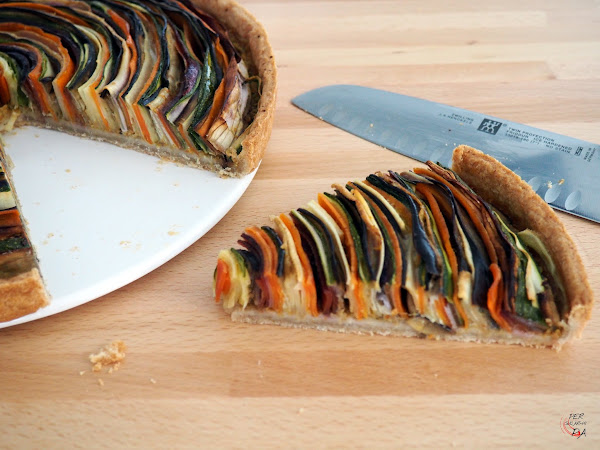 Nuestra versión utiliza berenjena, calabacín, zanahorias naranjas y moradas y chirivías, y va montada sobre una base de masa quebrada (brisa) y una pasta de puré de verduras con queso.