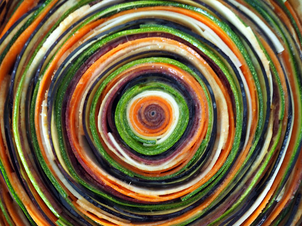 Enrollar las verduras, alternando colores, de dentro hacia afuera. Una vez tengáis un pequeño núcleo colocarlo en el centro de la tarta e ir añadiendo tiras de verdura alrededor hasta terminar de llenar la tarta.