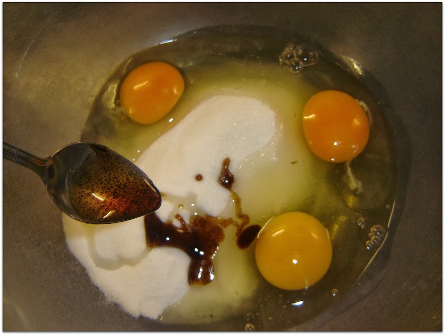 En un bol añadimos el azúcar, los huevos y el extracto de vainilla.