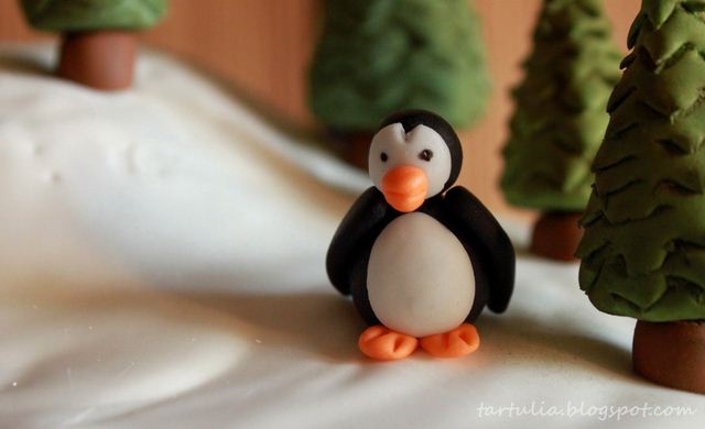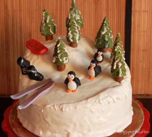 El relleno fue ganache de chocolate con leche. Cubrí toda la tarta en fondant blanco que asemejase la nieve y modele varios pinos con tronco y copa para colocarlos en la montaña. Prepare el día antes unos esquíes una tabla de snow y unos botas para colocarlas sobre la nieve, todo ello en pasta de goma.