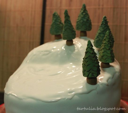 Antes de colocar la decoración de la tarta, con glasa y una espátula embadurne la superficie de la misma para acercarme un poco al efecto de la nieve de las pistas y una vez colocados los pinos, con glaseado mas suave y la misma espátula deje caer unas gotas de glasa la copa de los mismos para conseguir una visión de nieve mas real.
