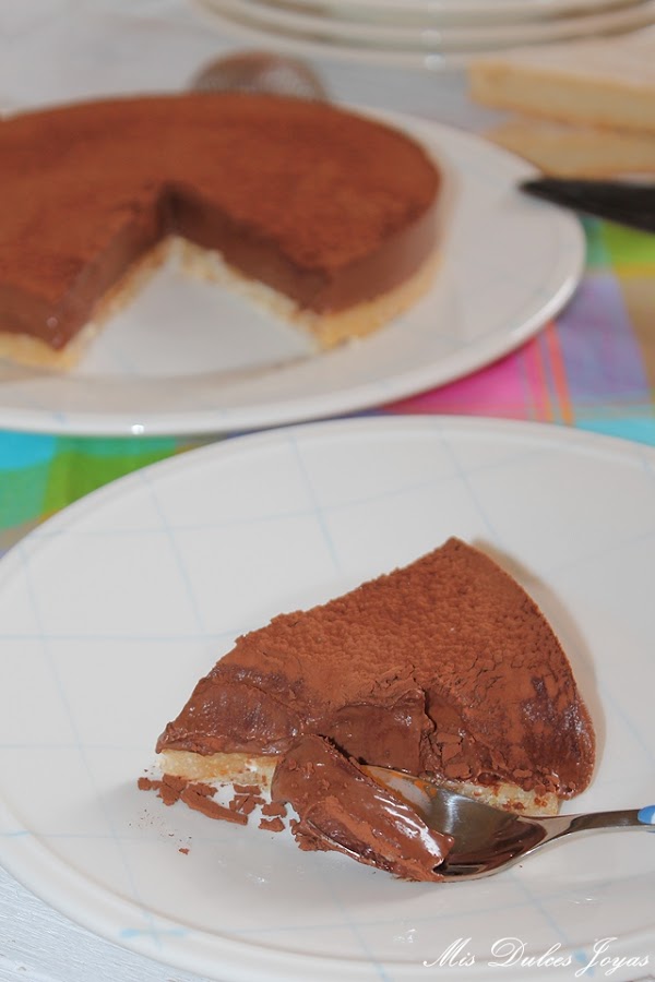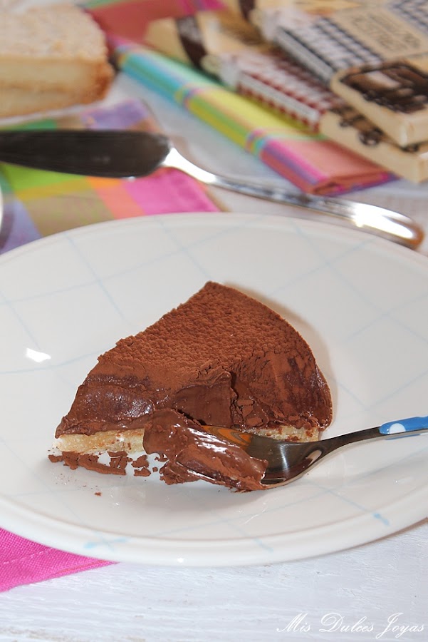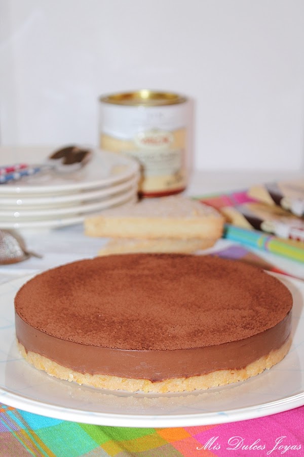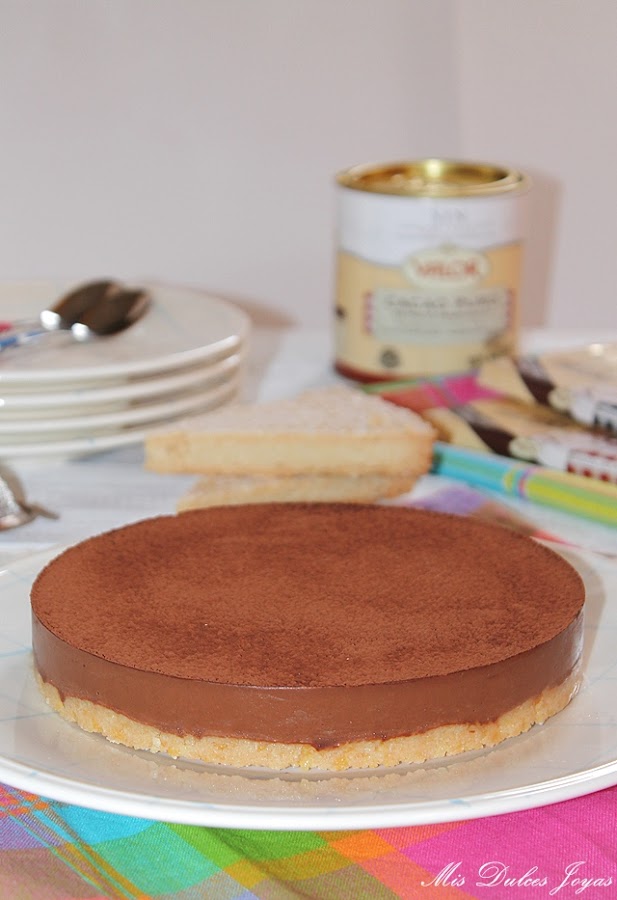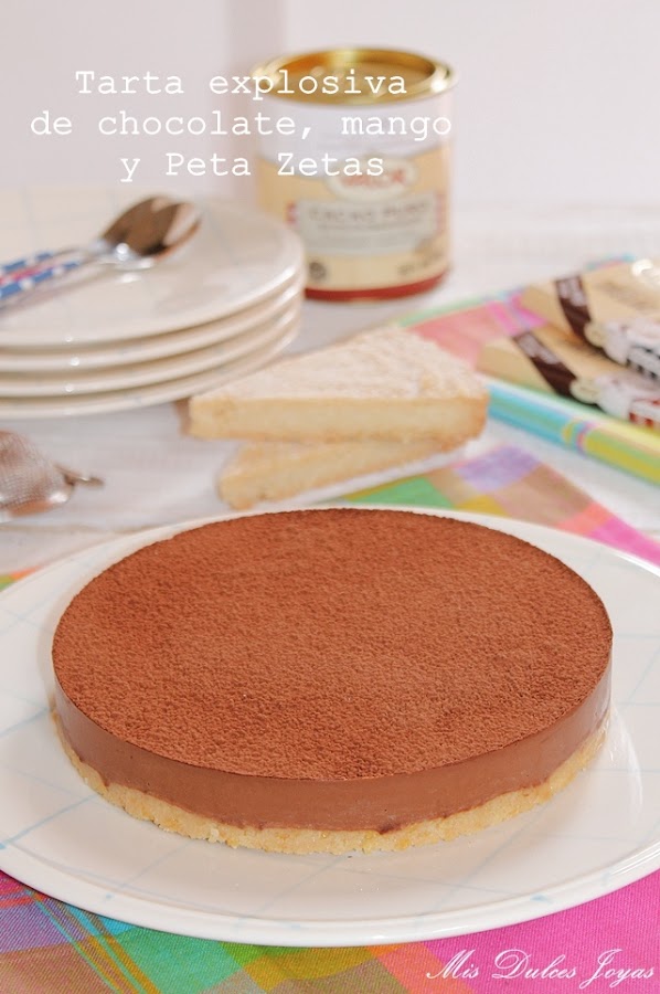 La tarta que os traigo hoy se compone de una base de galletas shortbread y Peta Zetas, una ganache (de dos chocolates) perfumada e enriquecida con fruta de la pasión (yo como no encontraba fruta de la pasión, he optado por prepararla con mango y ha quedado deliciosa), y una capa de pintura de chocolate y aceite suave. La capa de chocolate se aplica con la ayuda de una pistola de cocina, pero como yo no tengo este utensilio he optado por espolvorearla con cacao en polvo.