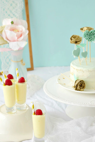 En ésta como sólo era para mí, he puesto la tarta, un recipiente metálico con esponjitas mint, unos caramelos de menta y unos shots de crema pastelera con yuzu y frambuesa. Deliciosos y tan simples que te asombrarías, ¡jajaja! Pero quedan perfectos.