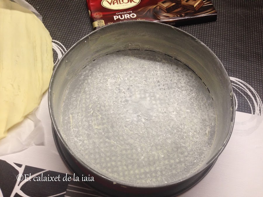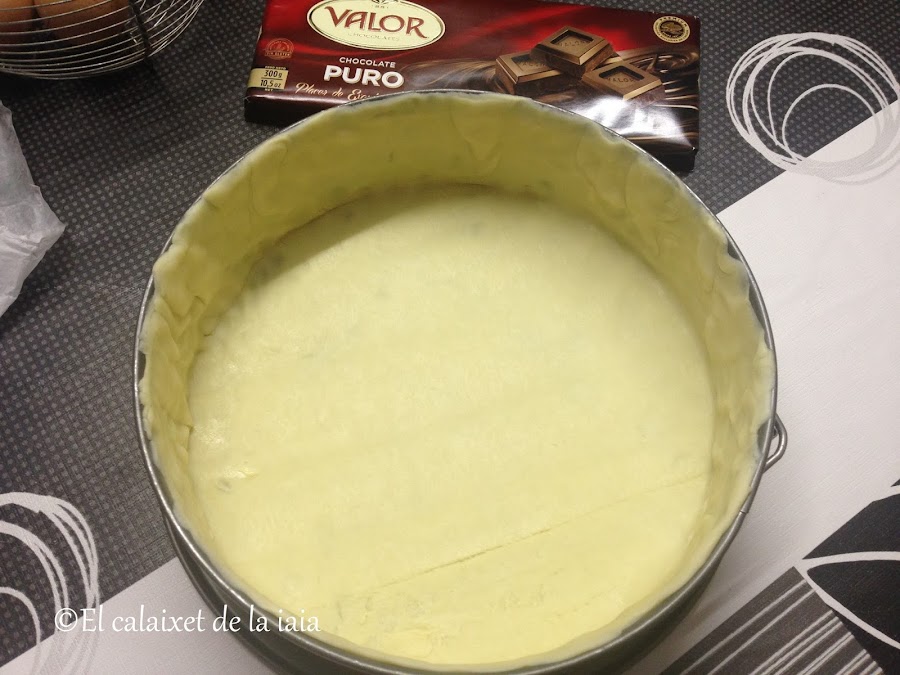 Sacamos un rato antes del frigo la masa y dejamos a temperatura ambiente. Forramos la base y el lateral del molde con la masa quebrada